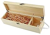 - Die Holzbox ist hergestellt aus unbehandeltem Nadelholz. Leichtes Material mit einer Wandstärke von 8 mm. Kiste riecht angenehm nach Holz. Ein einfacher Verschluss verhindert ein unbeabsichtigtes öffnen der Weinbox. Perfektes Geschenk für jeden Weinliebhaber und verleiht einem guten Wein eine hochwertige Holzverpackung.